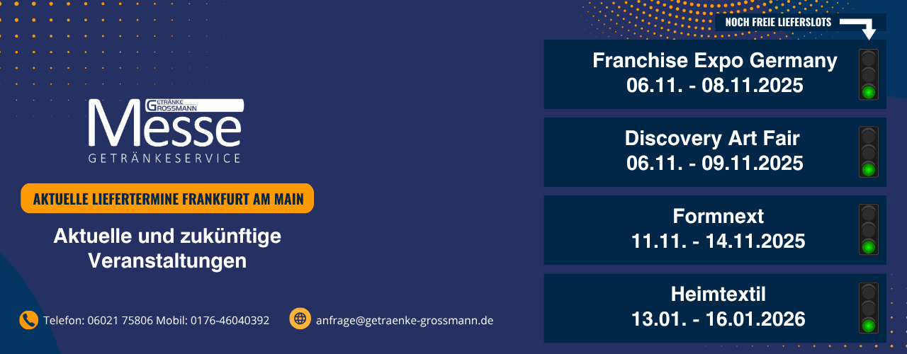 Bei Getränke Großmann profitieren Sie von einem erstklassigen Getränke Lieferservice bis zum Messestand, der speziell auf die Anforderungen von Messeausstellern in Frankfurt abgestimmt ist. Wir liefern zuverlässig an die Messe Frankfurt und das Messegelände in Offenbach – damit Ihre Besucher immer bestens versorgt sind. Kontaktieren Sie uns noch heute und erleben Sie den Unterschied eines professionellen Getränkelieferanten für Ihren Messeauftritt!