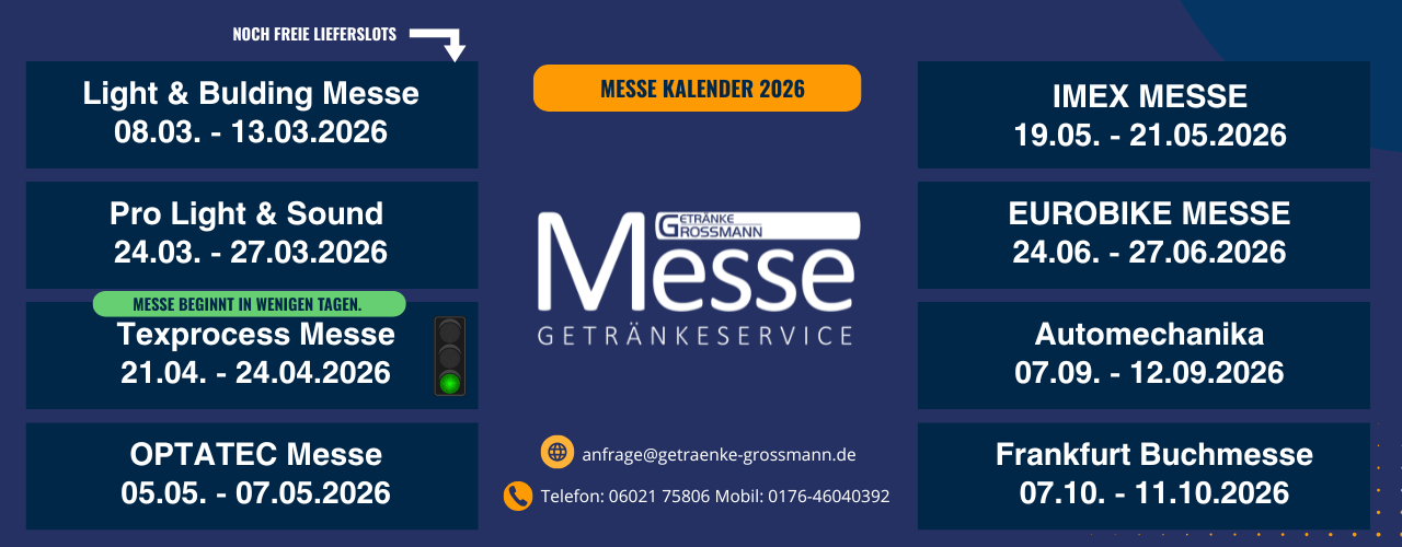 Willkommen bei Getränke Großmann – Ihrem zuverlässigen Getränke Lieferservice bis zum Messestand in Frankfurt! Als erfahrener Partner für Messeveranstaltungen in Frankfurt, insbesondere auf der Messe Frankfurt, sorgen wir dafür, dass Ihre Gäste stets mit erfrischenden Getränken versorgt werden. Unser professioneller Service garantiert eine pünktliche und reibungslose Lieferung direkt an Ihren Stand, sodass Sie sich voll auf Ihre Messepräsenz konzentrieren können. Vertrauen Sie auf unsere langjährige Erfahrung und unser umfangreiches Sortiment an Getränken für jeden Bedarf.